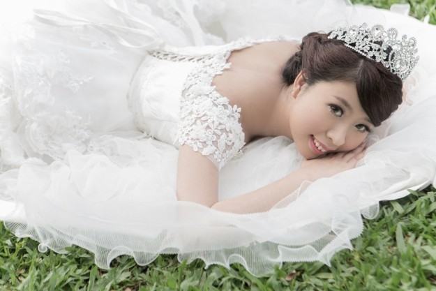 … wedding dress, she looks down and has the left hand near the breast