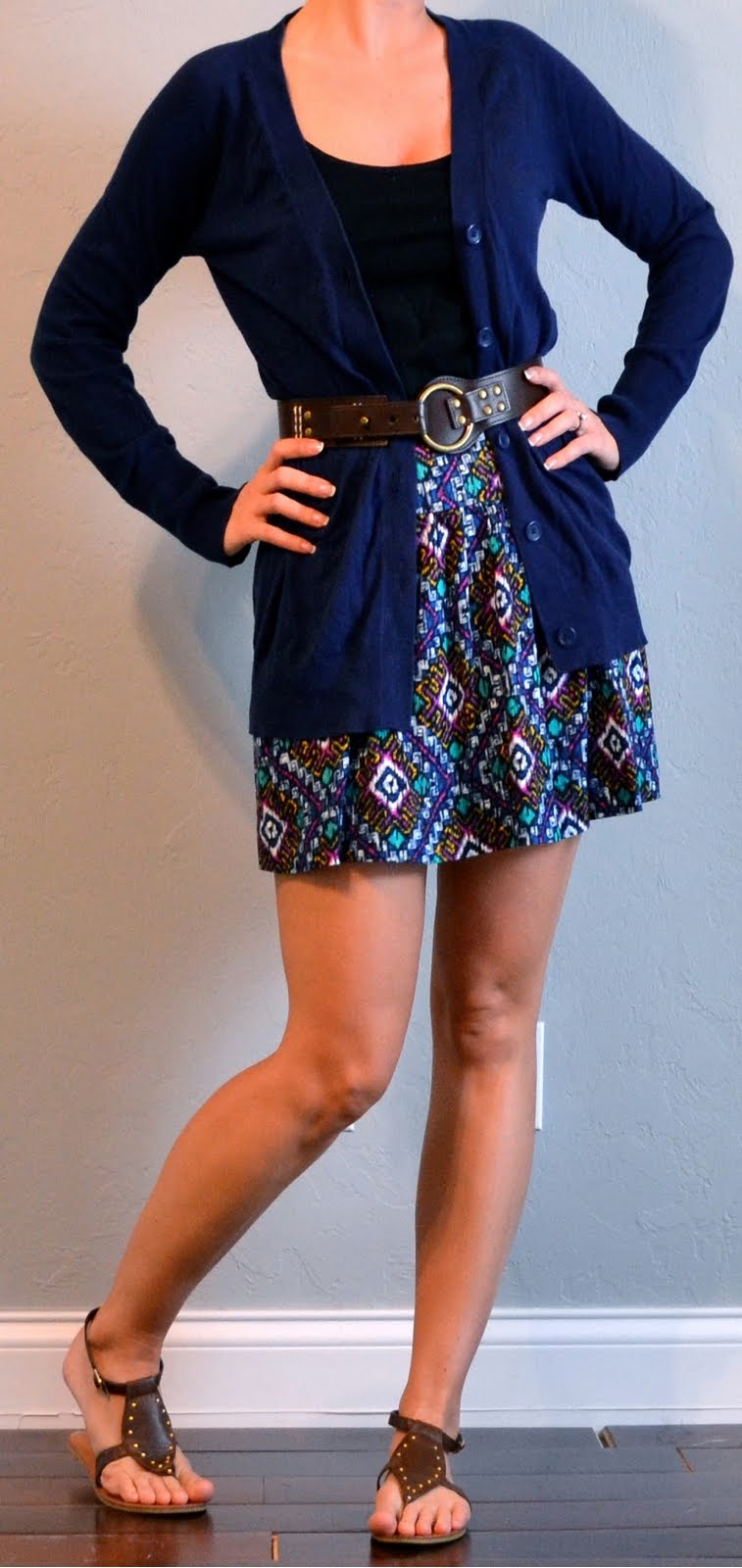 outfit post: ikat skirt, navy long cardigan, gladiator sandals …