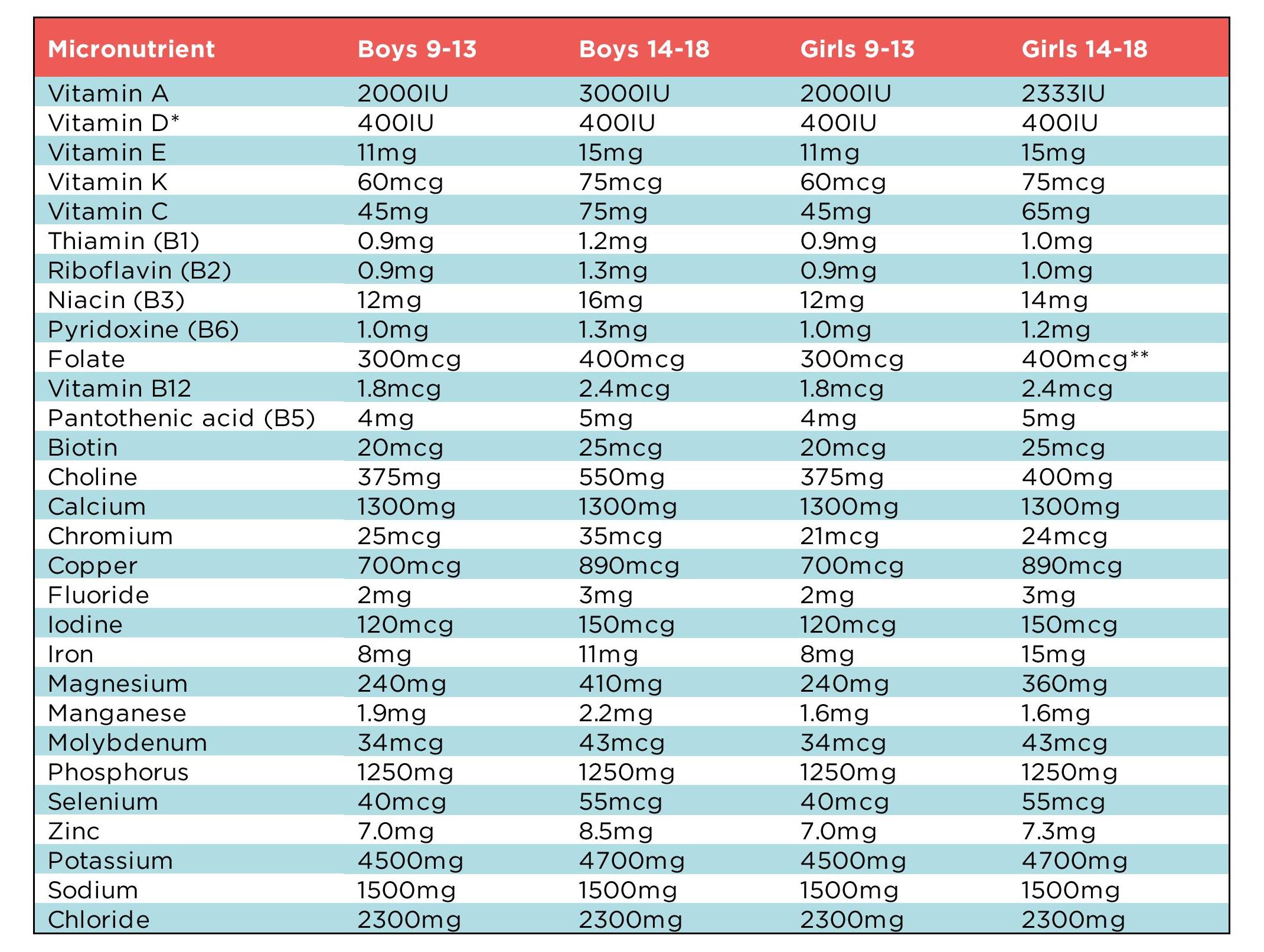 calcium adolescents 10 18 years 1000mg adults 19 50 years