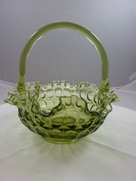 Vintage Fenton Green Glass Thumbprint Basket Ruffled Edge